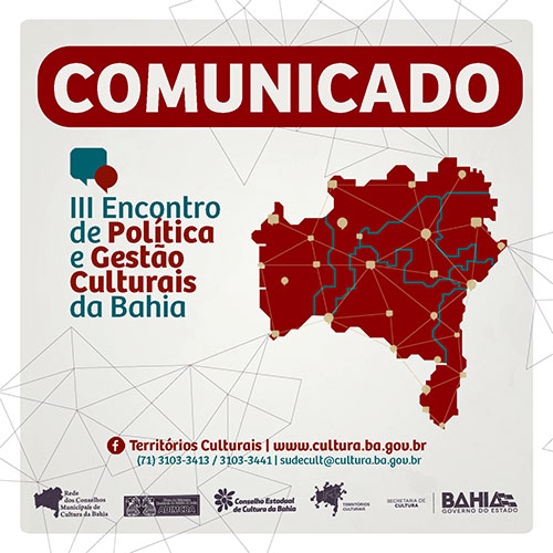 A Secretaria de Cultura do Estado da Bahia (SecultBA) comunica o adiamento do III Encontro de Política e Gestão Culturais. O evento, que aconteceria nos dias 16, 17 e 18 de dezembro de 2015, no Centro de Cultura João Gilberto – espaço cultural administrado pela Secretaria de Cultura do Estado em Juazeiro, será realizado em março de 2016. O motivo é o cenário de dificuldades orçamentárias de 2015, que inviabilizou o investimento necessário para as despesas envolvidas diretamente com a realização do evento.