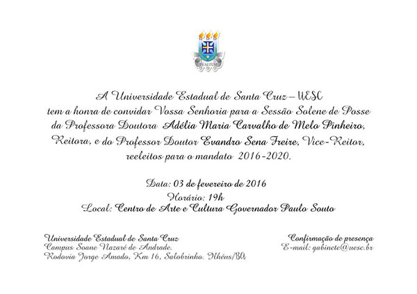 A reitora da Universidade Estadual de Santa Cruz, Adélia Pinheiro, participou da posse do novo diretor geral da Ceplac, Sérgio Murilo Menezes. A posse aconteceu na sede regional do órgão, em Ilhéus, e reuniu produtores, empresários, prefeitos, vereadores, sindicalistas e funcionários da Ceplac.