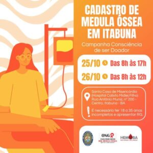 A Fundação Hemoba e a ONG Enaultinho Rocha promovem a “Campanha Consciência de Ser Doador” de cadastro de medula óssea em Itabuna, no sul da Bahia. A ação será realizada no Banco de Sangue da Santa Casa de Misericórdia (Hospital Calixto Midlej Filho), nos dias 25/10, das 8h às 17h, e 26/10, das 8h às 12h. O objetivo é mobilizar e conscientizar os jovens dos municípios da região sobre a importância do cadastro e ampliar o número de possíveis doadores, já que a faixa etária para o cadastramento é entre 18 e 35 anos incompletos.